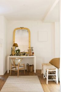 Otra opción popular es colocar un espejo sobre el tocador o cómoda. Además de ser práctico para arreglarse, este tipo de espejo puede servir como un punto focal decorativo, añadiendo estilo y elegancia a la habitación.