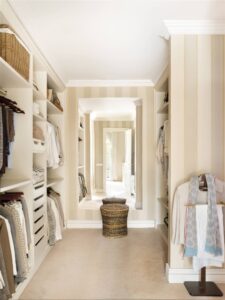Uno de los lugares más comunes es colocar un espejo de cuerpo entero en tu vestidor o armario. Esto no solo te permite revisar tu apariencia completa al vestirte, sino que también puede ayudar a que la habitación parezca más grande y luminosa.
